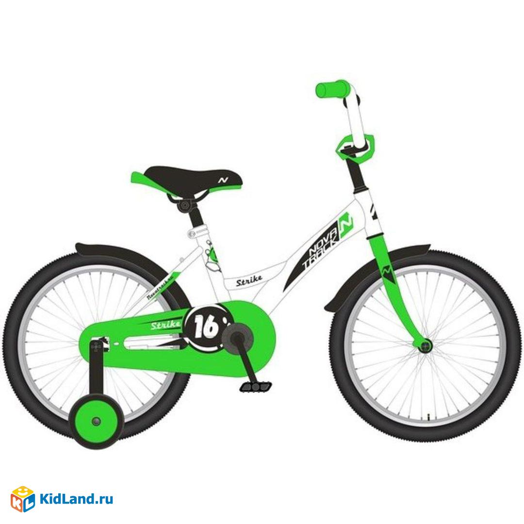 Велосипед NOVATRACK 12", STRIKE, белый-зелёный, тормоз ножной, короткие крылья, полная защита цепи, нет багажника