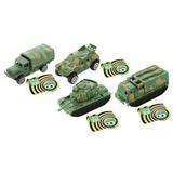 В одном дисплее - 30 игрушек: военная техника в виде пластмассовых машинок с инерционным механизмом и фигурки солдат. Длина игрушек - 9-10 см. Фигурка солдата - 6 видов, всего 12 шт. в дисплее. Танк - 5 шт., грузовик - 4 шт., ракетная установка залпового огня - 5 шт., многоцелевой армейский бронеавтомобиль - 4 шт. Фигурки солдатиков упакованы в пакет размером 9х15 см. У каждой единицы военной техники есть индивидуальная этикетка.
