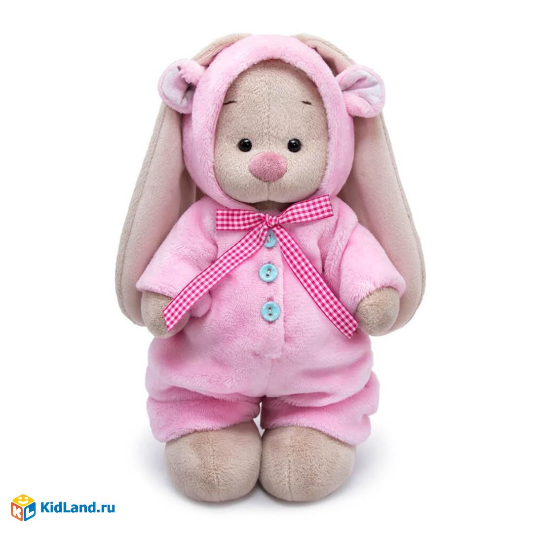 Зайка в очень трогательном и невероятно уютном комбинезоне цвета розовой воды. Комбинезон сшит из мягкого ворсистого софта. Комбинезончик с капюшоном с ушками, с длинными рукавами, спереди застёгивается на три мятные пуговки. Игрушка поставляется в оригинальной подарочной упаковке.