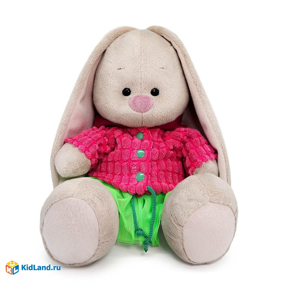 Зайка Ми в ярком комплекте: малиновая курточка с капюшоном и юбочка. Курточка сшита из ячеистого вельвета, с застежкой на зеленые кнопки и с утяжкой по низу на зеленый шнурок. Капюшон сшит из х/б футера бордового цвета. Юбочка из невесомой сеточки жасминово‑зеленого цвета. Игрушка поставляется в подарочной коробке.