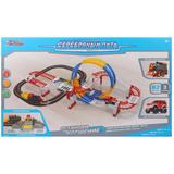 В состав набора входит новый элемент: железнодорожный переезд. Переезд оснащён шлагбаумом. При закрытом шлагбауме машинка останавливается. Горит красный сигнал светофора. При открытом шлагбауме машинка начинает движение. Включается зелёный сигнал светофора. В набор включён игровой элемент "Мёртвая петля". Количество деталей в наборе: 54 шт. Длина пути железной дороги: 169 см. Длина пути автотрека: 242 см. 3 уровня. Размер в сборе: 102 * 65 * 32 см. Питание паровоза - 2*АА (нет в комплекте). Свет двух фар спереди, звук: гудок паровоза, стук колёс. Питание джипа: 1*АА (нет в комплекте). Свет фар (мигание синий и красный свет); посветка пути (лампа расположена сзади и светит вниз). Питание светофора на железнодорожном переезде: 2*АА (нет в комплекте).